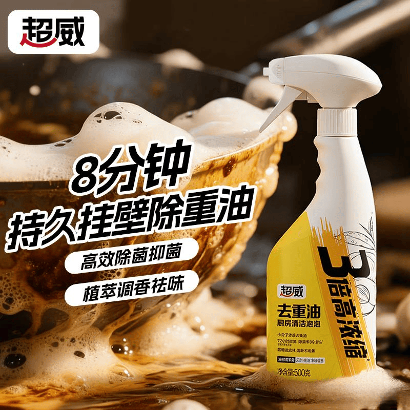 这款超威重油污清洁剂专为中式厨房设计,采用3倍浓缩去油配方,去油率高达99.3%。对于炒菜留下的顽固油垢,效果非常明显。它的泡沫能持续挂壁8分钟,充分浸泡油污,清洁起来轻松省力。