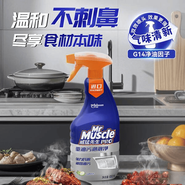 威猛先生清洁剂采用进口G14净油因子和Micellar卸妆技术,像磁铁一样抓住油污,轻松将顽固油渍瓦解成水分子,擦一擦就干净,确实省力不少。它的配方温和,不会刺激皮肤,也不会伤害厨房的各种材质,用起来非常放心。